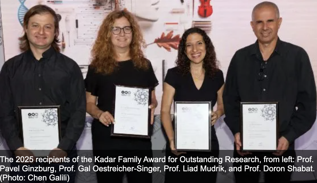 The 2025 laureates include: Prof. Liad Mudrik (Psychological Sciences & Neuroscience) for her exploration of consciousness and tests of AI and animal consciousness; Prof. Pavel Ginzburg (Engineering) for breakthroughs in nano-photonics and systems detecting hostile drones under extreme conditions; Prof. Doron Shabat (Chemistry) for innovative chemiluminescent materials and smart polymers for targeted cancer therapies; and Prof. Gal Oestreicher-Singer (Management) for pioneering research in AI-driven digital platforms and consumer behavior modeling. These scholars exemplify the Kadar family’s vision of lifting up ideas that are rigorous, cross-disciplinary, and globally relevant. Learn more about their work and watch video highlights here.